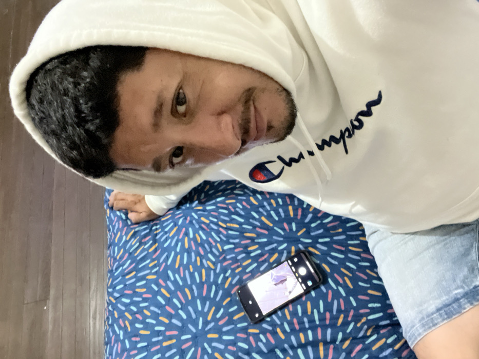A man wearing a white Champion hoodie and denim shorts looks down at the camera. His dark hair is visible under the hood. He's lying on a bed with a colorful, patterned duvet cover, and a smartphone rests on the bed next to him. The floor is visible in the corner.