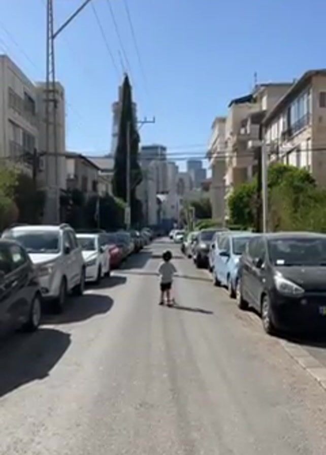A boy riding a scooter is seen from behind, heading away from the camera down a straight street lined with parked cars on both sides
