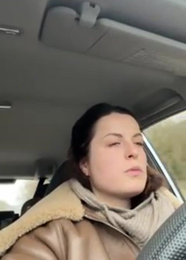 A young woman is driving a car. She's wearing a brown leather jacket with a sherpa collar and a beige turtleneck sweater. She has dark hair pulled back and blue eyes. The interior of the car is light gray. Music is playing in the background. The woman is looking at the road ahead and appears focused on driving. The environment outside the car appears to be a wooded area.