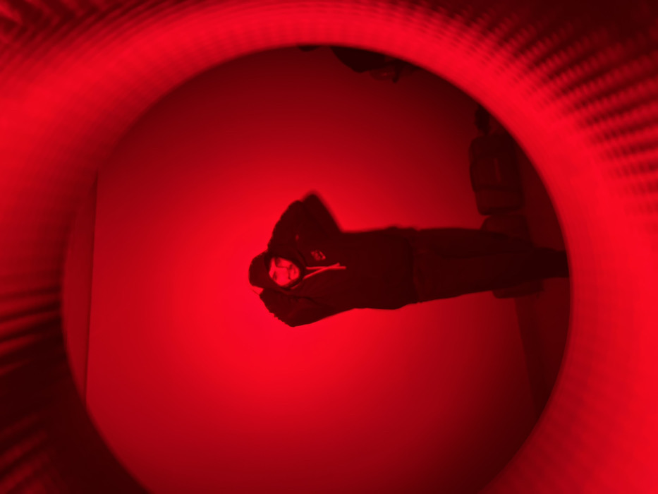 A figure, possibly a person in dark clothing with a hood up, is visible in a circular frame, possibly a tunnel or tube. The entire scene is bathed in red light. The figure appears to be lying down with arms raised, maybe resting their head on their hands. Behind the figure, indistinct shapes or objects are barely discernible against the red backdrop. The circular frame shows texture, potentially from the material or construction of the tube.