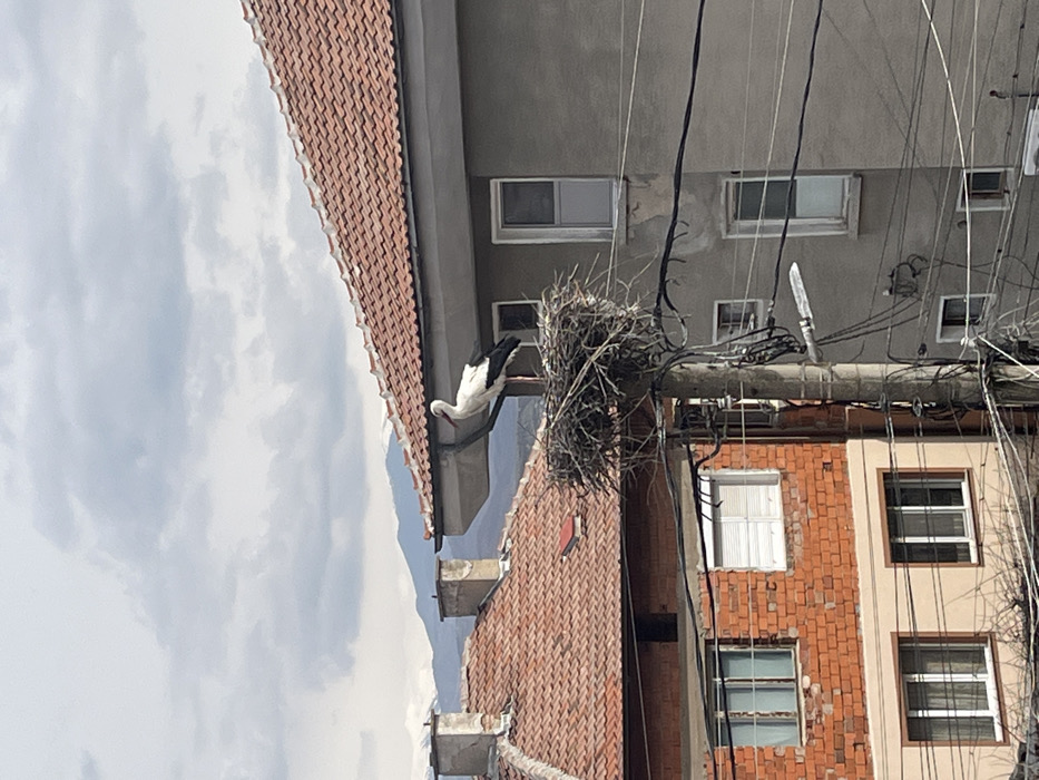 - "In the city of Pokrovnik, Bulgaria, a white stork with black wing feathers, a red beak, and red legs stands upright in a large, stick-built nest positioned atop a utility pole" by FM-8osjd2, licensed under CC BY 4.0