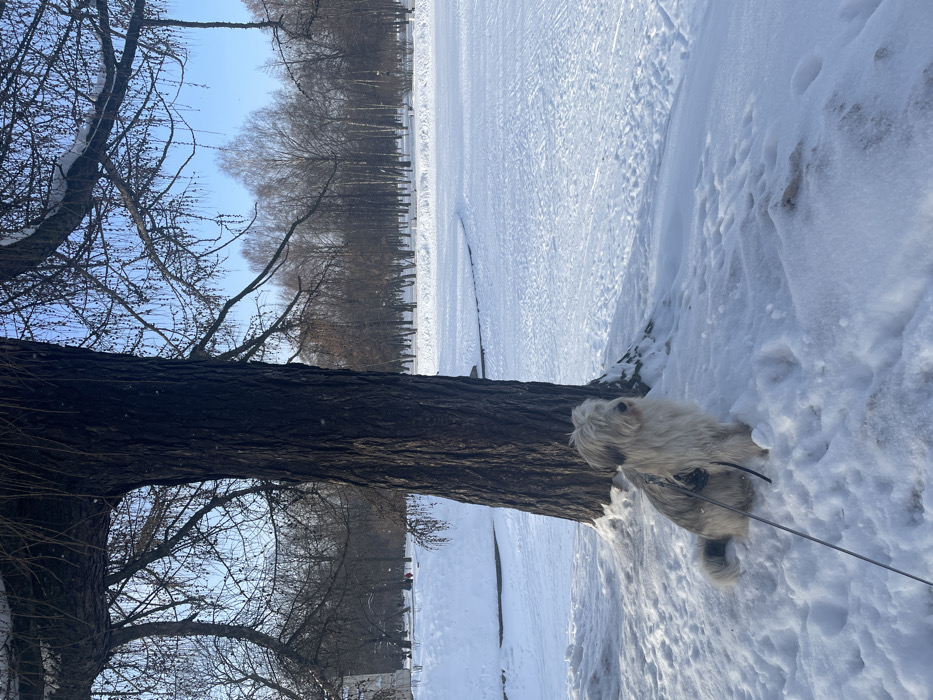 - "A medium-sized white dog stands on a snowy bank next to a large, dark tree trunk" by FM-x1BiS2, licensed under CC BY 4.0