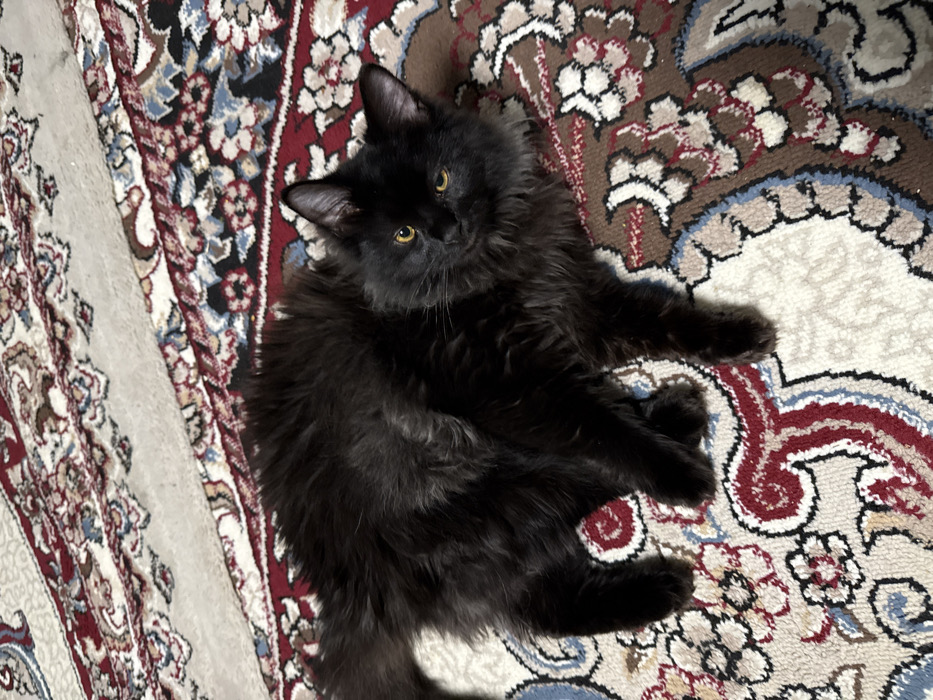 - "A black, fluffy cat rests on an ornate rug" by FM-7p9nD3, licensed under CC BY 4.0