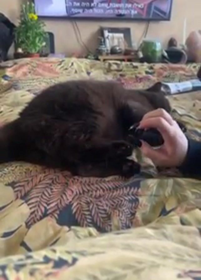A person is petting a fluffy, dark-colored cat on a bed with a patterned bedspread. The cat is lying on its side, facing away from the camera. The person gently touches and strokes the cat's paws, then moves to the cat's head. The cat responds to the petting, stretching its limbs slightly. In the background, there's a TV displaying what looks like a home improvement show in Hebrew. There are also various objects on the bed and around the room, including a plant, books, and other decorative items.