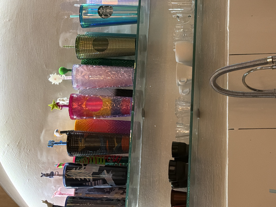 A glass shelf displays a collection of colorful Starbucks tumblers. Each tumbler has a distinct pattern and color scheme, with some featuring decorative straws. The collection includes holographic, studded, and printed designs. On the adjacent shelf are arranged small glass cups and dark cylindrical objects, possibly lids or accessories. A flexible metal hose is visible in the background.