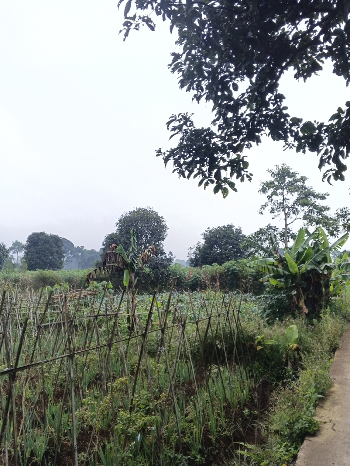 A lush garden thrives under a cloudy sky, showcasing rows of crops supported by a bamboo trellis system. Banana trees and other greenery populate the background, contrasting with the cultivated rows of what appears to be onions or similar crops. Overhanging branches provide a partial frame. A paved path runs along the garden's edge. The scene suggests a tranquil rural setting, possibly a small farm or backyard garden.