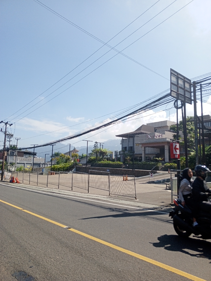 This image captures a daytime scene on a paved road in Multhan, India, with a multi-story building complex and distant mountains under a clear sky. In the foreground, an asphalt road is visible with a solid yellow line running along its left edge and a parallel solid white line further right. Adjacent to the road, a paved area is delineated by a series of temporary metal crowd barriers. Several orange traffic cones are positioned behind these barriers. In the midground, a dark-colored motorcycle with two occupants is present on the right side of the road, facing away from the viewer. The driver wears a dark helmet and dark clothing. The passenger, seated behind, wears a light-colored top and dark trousers, with their head covered by dark hair or a headscarf. Shadows from the motorcycle and its occupants are cast onto the road surface. Elevated and set back from the road, a modern multi-story building complex is the central structure. The building features large windows and multiple roof levels, with the name "TAO SORE" visible on its facade. An "OUT" sign with a red left-pointing arrow is affixed to a pole near the building's entrance. The surrounding area is landscaped with green foliage and features multiple contemporary streetlights. Overhead utility poles and a dense network of electrical wires span across the upper section of the image. In the background, a range of mountains or large hills is visible beneath a clear blue sky with minimal cloud cover. Faint outlines of additional structures are discernible on the distant left horizon.