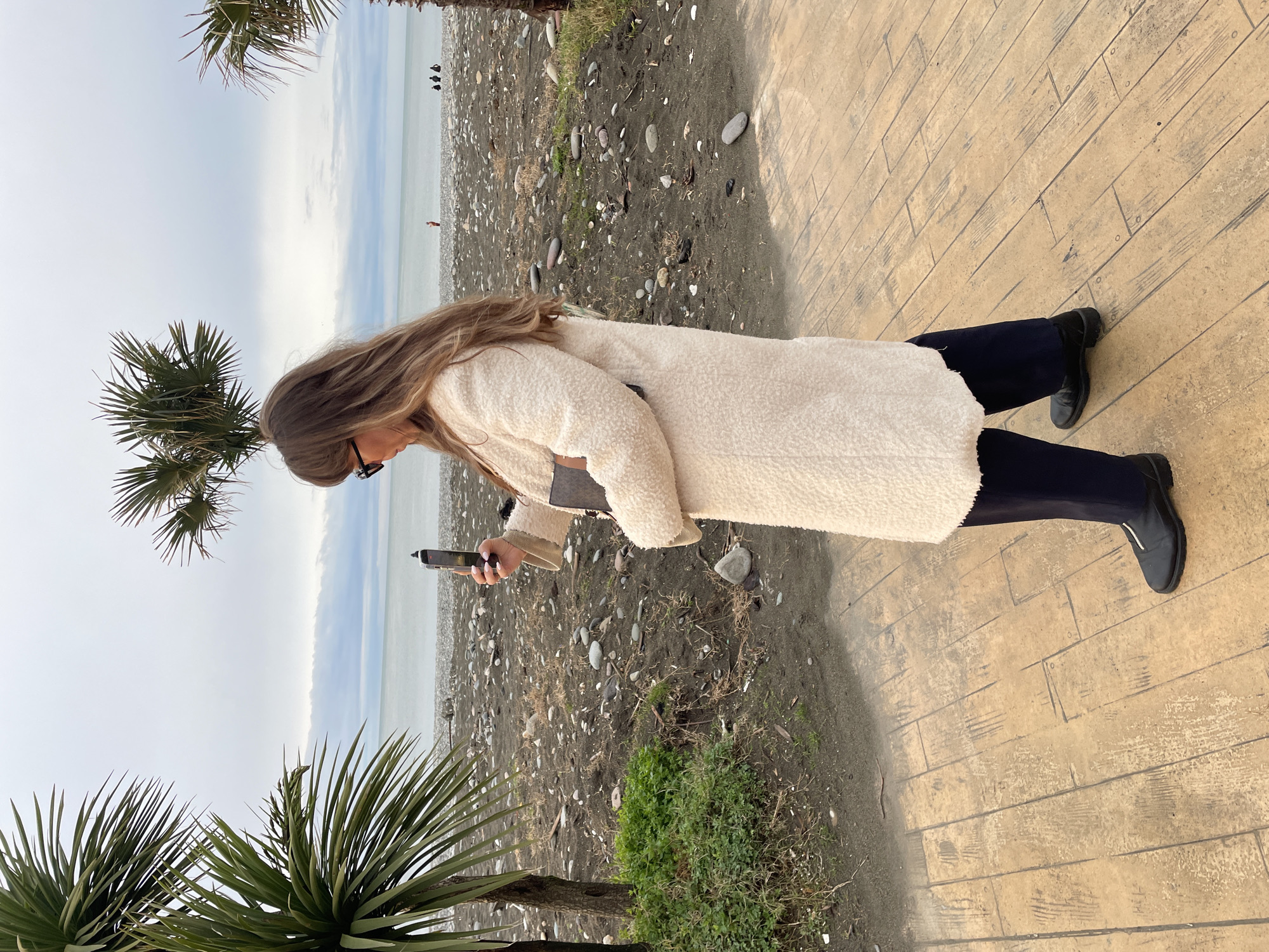 A woman in a cream-colored, fuzzy coat and black pants stands on a tan, patterned walkway. She is holding a black smartphone and appears to be taking a picture or looking at something on the screen. The walkway is adjacent to a beach with dark sand and pebbles. The sea and a cloudy sky are visible in the background. Some palm trees are on the left side of the image. The scene is likely taken in Batumi, Georgia, due to the presence of the distinctive dark sand beaches and palm trees typical of the region.