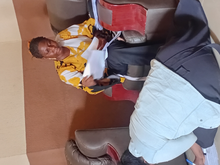 Two people are seated indoors. A woman wearing a yellow and white patterned top holds papers. Seated next to her is a person in a light-colored button-down shirt and dark pants. The setting appears to be a living room with brown carpeting and various pieces of furniture, including a red-accented chair and a leather sofa. The lighting is bright, suggesting the photo was taken during the day.