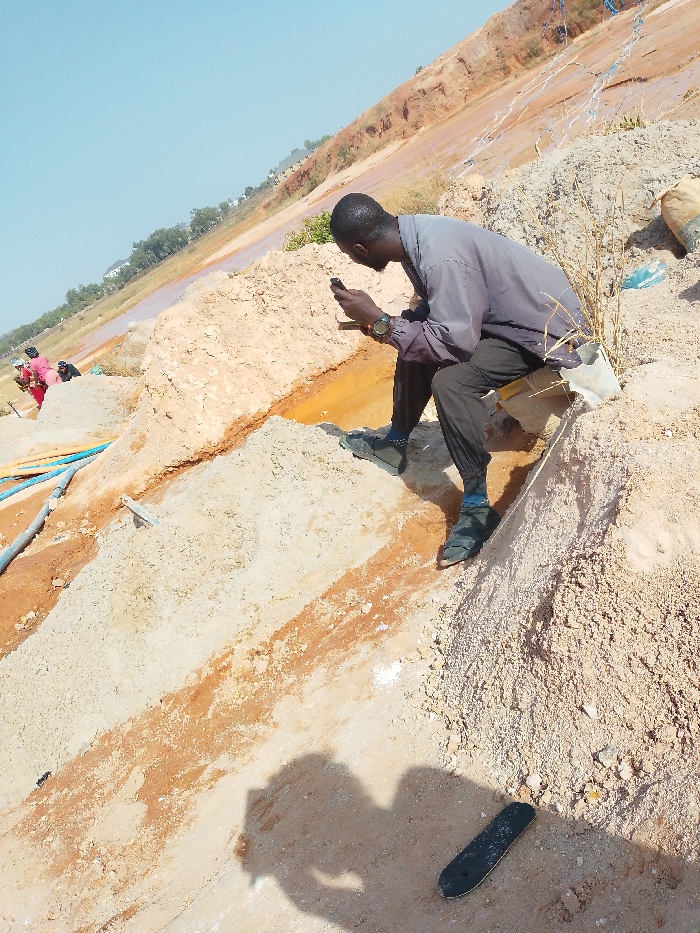 The image depicts an open-air excavation site in Jos, Nigeria, under a clear daylight sky. In the mid-ground, a dark-skinned male individual is seated on a light-brown earthen mound, wearing a dark long-sleeved shirt, dark trousers, and dark sandals over blue socks. He is actively engaged with a black smartphone held in both hands, with a dark wristwatch visible on his left wrist. To his immediate right, a white plastic container is partially embedded in the earth. The ground in the foreground displays the shadows of two individuals and a detached black shoe sole. The surrounding environment consists of uneven terrain dominated by large mounds of reddish-brown and lighter-colored earth, consistent with significant earthmoving or mining activities. Visible channels on the ground contain reddish-orange water or wet sediment. Blue and white hoses or pipes are laid across the site, extending into the background. Further into the scene, several additional individuals are present, performing various tasks; one person is clearly visible wearing a red garment. The distant background features green vegetation and what appear to be structures or buildings, indicating proximity to a developed area.