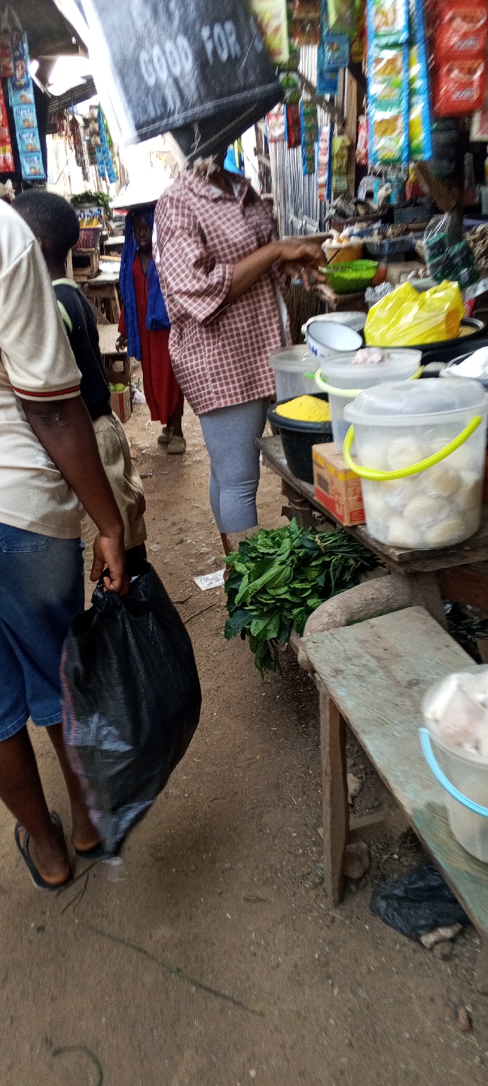 The image depicts an outdoor market scene in Nassarawa, Nigeria. In the left foreground, a person is partially visible, wearing a light-colored short-sleeved top with red and brown trim, blue denim shorts, and dark flip-flops, holding a black plastic bag by its tied top. To their immediate right, a makeshift wooden market stall is present. On the stall, from left to right, are a cluster of green leafy vegetables, a light-colored wooden object resembling a pestle, and several containers: a black bucket with yellow granular contents, multiple transparent plastic buckets (one with a yellow handle containing white spherical food items, another with a blue handle), a green plastic bowl, and a yellow plastic bag. Behind this stall, a person wearing a brown and white plaid short-sleeved shirt and grey leggings is standing, with a large, dark rectangular bag, partially displaying the white text "GOOD FOR", balanced on their head. Their right hand is positioned over the stall's contents. In the mid-ground, slightly to the left of the central figure, a third person is visible, wearing a red long dress and a blue head covering. The background shows additional market structures with corrugated metal roofing, wooden supports, and numerous small, individually packaged items hanging from strings. The ground surface is a compact, reddish-brown earth path.