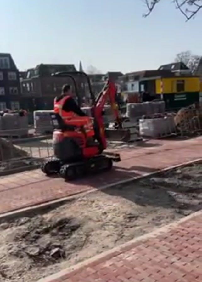 A man operates a red mini excavator on a partially paved area of red bricks. He wears a bright orange safety vest. Pallets of bricks are stacked nearby. Construction equipment, including a yellow and blue truck with writing on the side, is in the background. Buildings are visible across the construction zone. The day is sunny.