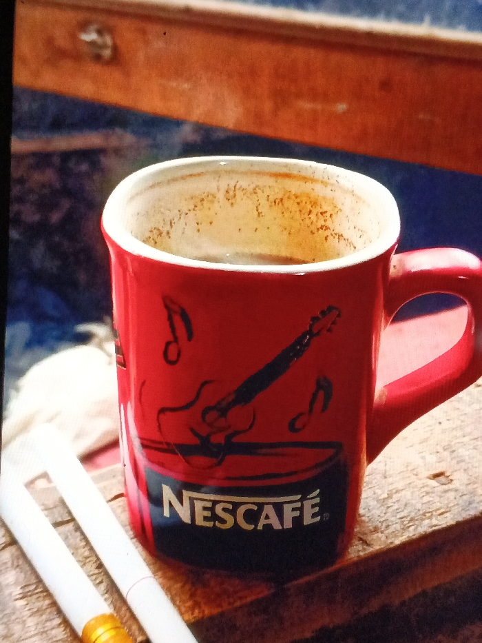 - "A red Nescafe mug, adorned with a guitar and musical notes, sits on a wooden surface" by FM-2fpsE3, licensed under CC BY 4.0