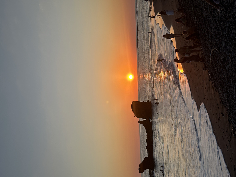 A vibrant sunset illuminates a beach scene. The sun casts a golden glow over the ocean, with silhouettes of people enjoying the water's edge. Rocks jut out from the sea, adding a dramatic element to the landscape. The sky transitions from blue to orange, mirroring the sun's radiant hues. The scene is captured in a vertical composition, accentuating the height of the sky and the depth of the ocean.