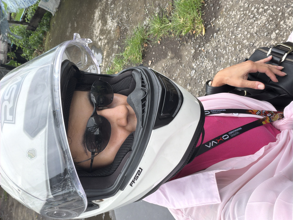 A person wearing a motorcycle helmet and sunglasses is captured in a close-up shot. The helmet is white with a clear visor. The person is wearing a pink shirt or dress. A black purse with a strap is visible on their left side, along with a black lanyard with white writing. The background is blurred and shows foliage, suggesting an outdoor setting.