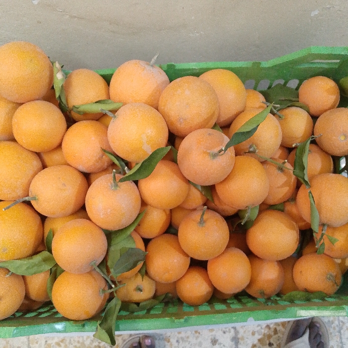 - "The image displays a large quantity of freshly harvested oranges piled within a green plastic produce crate" by FM-o4pOG2, licensed under CC BY 4.0