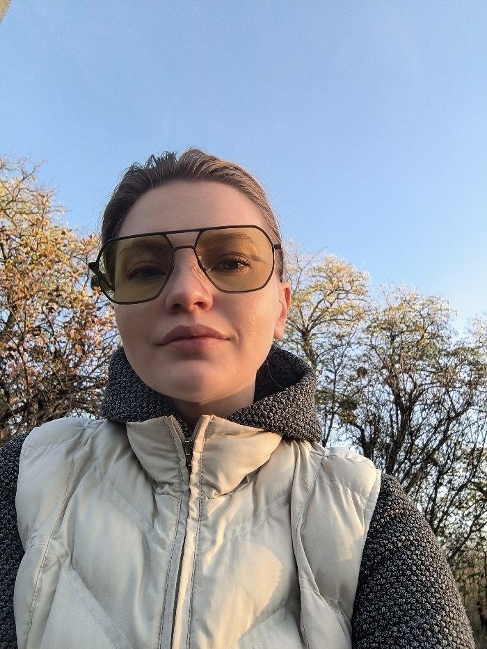 This image is an outdoor selfie, likely taken in Parkhomivka, Ukraine, featuring a light-skinned female. The subject is positioned centrally, facing the camera with a neutral expression. She wears black-framed aviator-style sunglasses with yellow-tinted lenses, a light-colored (beige or cream) zippered puffer vest, and a dark grey, textured hooded sweatshirt. Her hair appears pulled back. Warm, directional sunlight illuminates her face and the front of her clothing. The background consists of a clear, bright blue sky dominating the upper frame, with deciduous trees visible below. Trees on the left exhibit light-colored, possibly autumnal or early spring foliage. Trees on the right are mostly bare, displaying visible dark clumps on their branches, consistent with parasitic growth such as mistletoe. The camera perspective is angled upwards from below eye level.