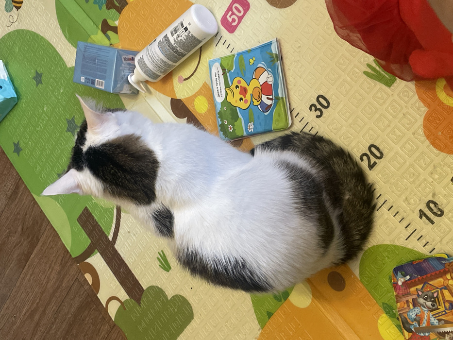 An indoor scene in Tolyatti, Russia, depicts a domestic cat situated on a child's playmat