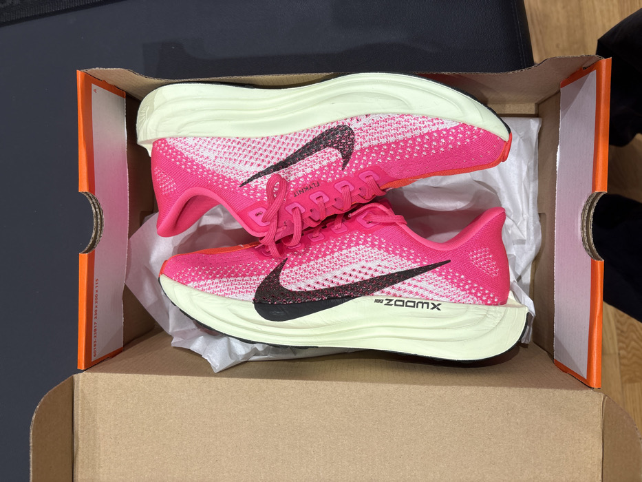 A pair of new athletic running shoes is displayed inside an open brown corrugated cardboard shoebox. The shoes feature a vibrant pink and white patterned Flyknit upper with black speckled Nike swooshes on both sides and bright pink laces. The substantial midsole and outsole are a light, almost fluorescent lime green. Text reading "ZOOMX" is visible vertically on the outer sole of the left shoe. The shoebox has an orange interior rim, and part of a label with text "60183-22817 330 x 200 x 115" is visible on the inside flap. White tissue paper surrounds the shoes within the box. The box rests partially on a light wooden floor (bottom left) and a dark, possibly upholstered or leather, surface (bottom right and top right background). No people are visible. The image contains no visual information or landmarks to indicate a specific geographical location; therefore, the location in the city of Tel Aviv, Israel, cannot be confirmed from the provided visual evidence.