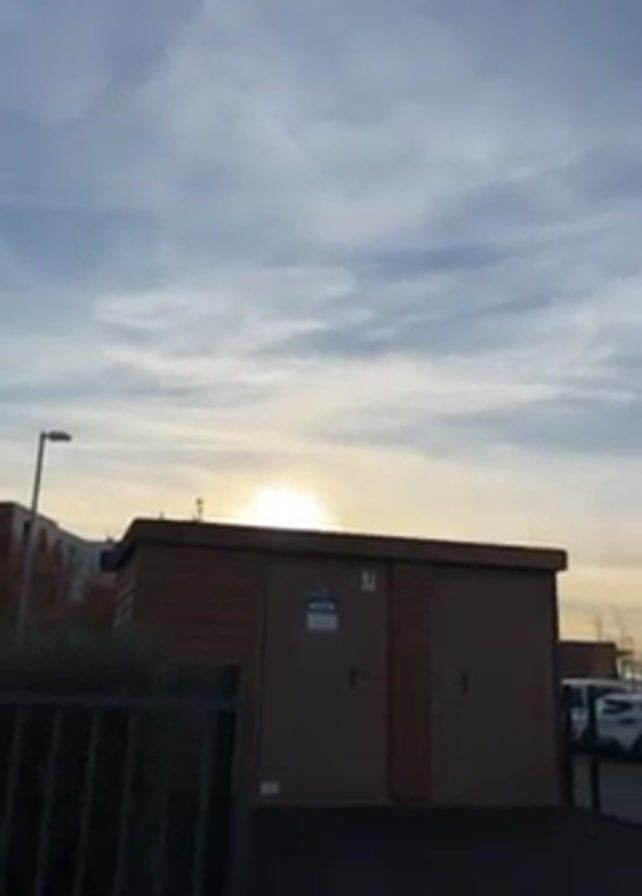 brown electrical box with two doors, situated in a paved area. A black metal fence borders the scene. Behind the box, the sun is setting behind buildings, creating a bright glare. The sky is cloudy with light blue patches. A street light is visible on the left, and parked cars are on the right. Some trees with reddish leaves are also visible in the background.