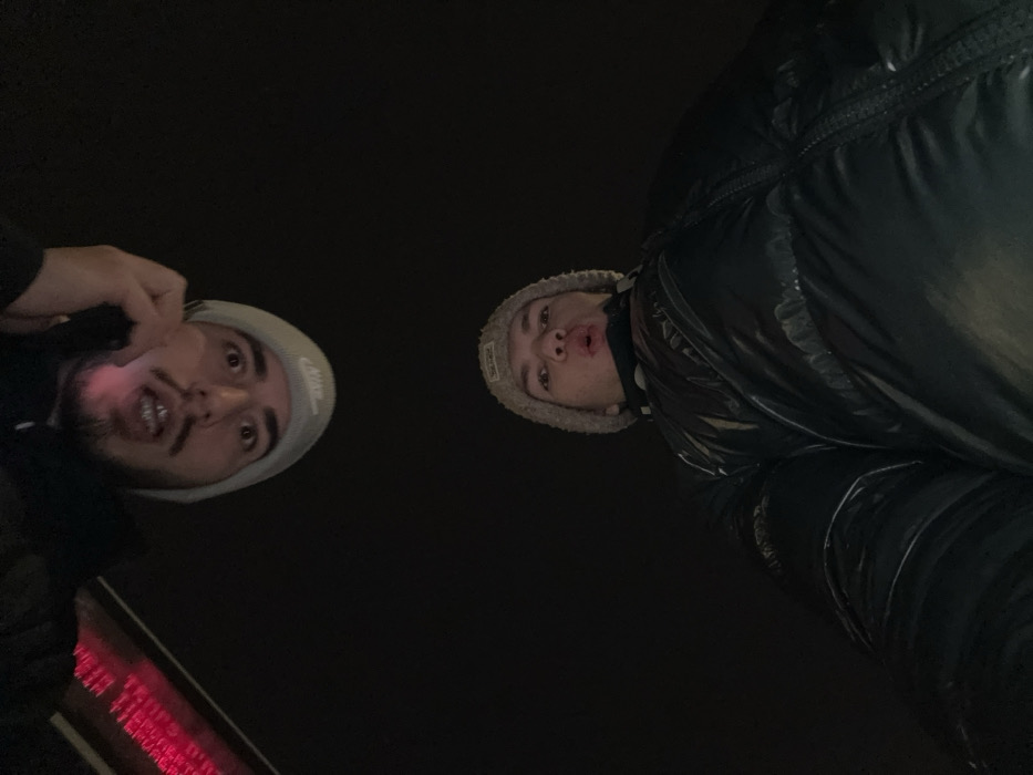 Two people look down at the camera from a low angle. One is on the left wearing a light gray beanie, dark jacket, and has a beard. The other is on the right wearing a darker gray beanie, black jacket, and appears to be making a duck face. The background is mainly dark except for a red glowing light on the lower left corner of the image.