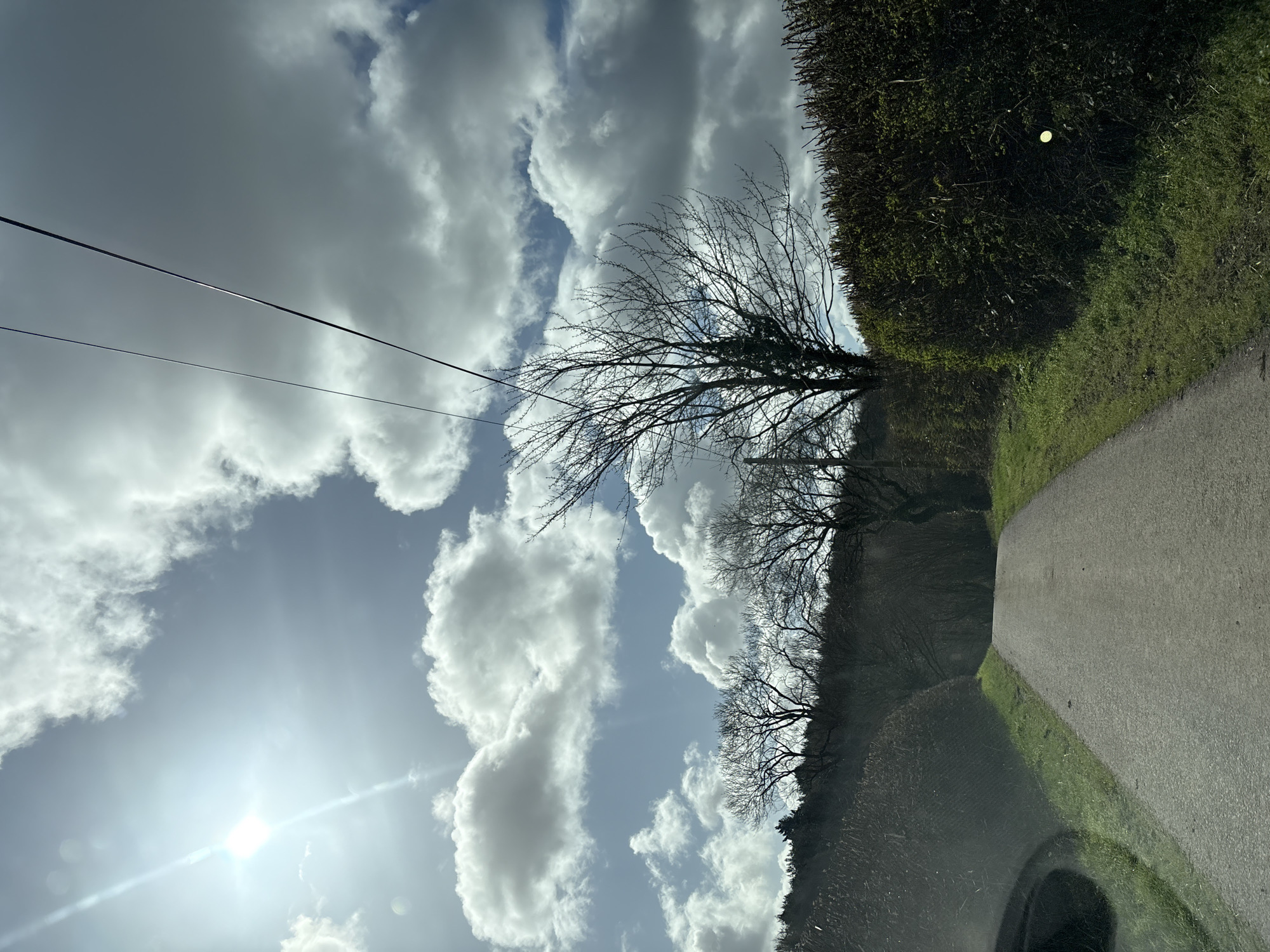 This image captures a rural road scene in Pulverbatch, United Kingdom, viewed from the interior of a vehicle, evidenced by a dark curved structure visible in the lower left. A narrow, grey, single-lane road extends into the distance, making a gentle left curve. Dense, dark green hedges line both sides of the road, separated from the road surface by narrow strips of green grass verge. Beyond the hedges, numerous bare-branched deciduous trees are visible, indicating late winter or early spring, forming a dense treeline and a wooded area on an upward slope to the left. A prominent, bare deciduous tree, partially covered in ivy, stands on the right side of the road, adjacent to the hedge, with a utility pole partially obscured behind it. Two dark utility lines traverse horizontally across the upper central sky. The sky features bright blue patches interspersed with white and grey cumulus clouds. The sun, positioned in the upper left, emits a strong light source, creating a distinct lens flare. No individuals, animals, or explicit actions are present in the depicted scene.