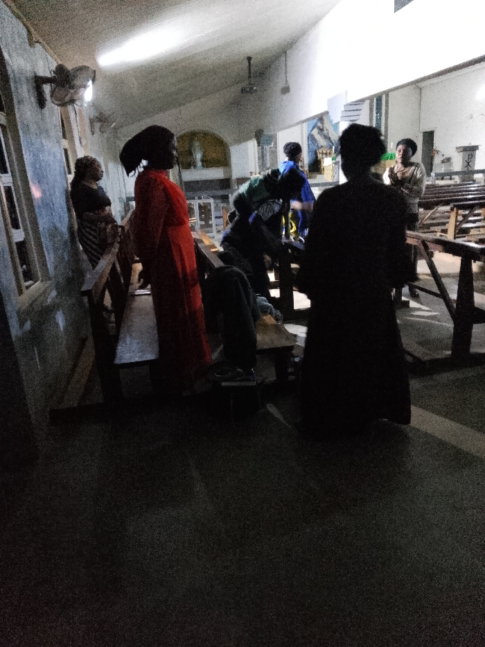 Inside a church, several individuals occupy the pews. A woman in a vibrant red dress stands out. Others are seated or kneeling, their features obscured by the low lighting. In the background, a statue of the Virgin Mary is visible, adding to the religious atmosphere. The room is sparsely lit, with ceiling fans providing ventilation. The benches are simple wooden structures, typical of church interiors.