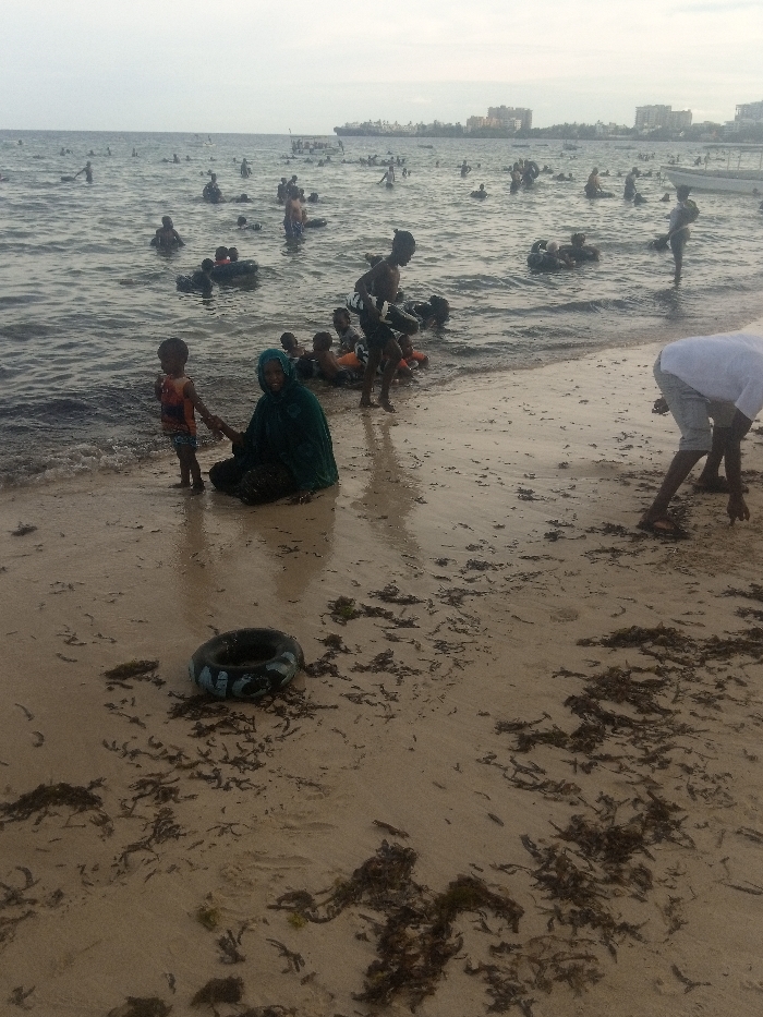 The image displays a busy coastal scene in Shanzu ward, Kenya