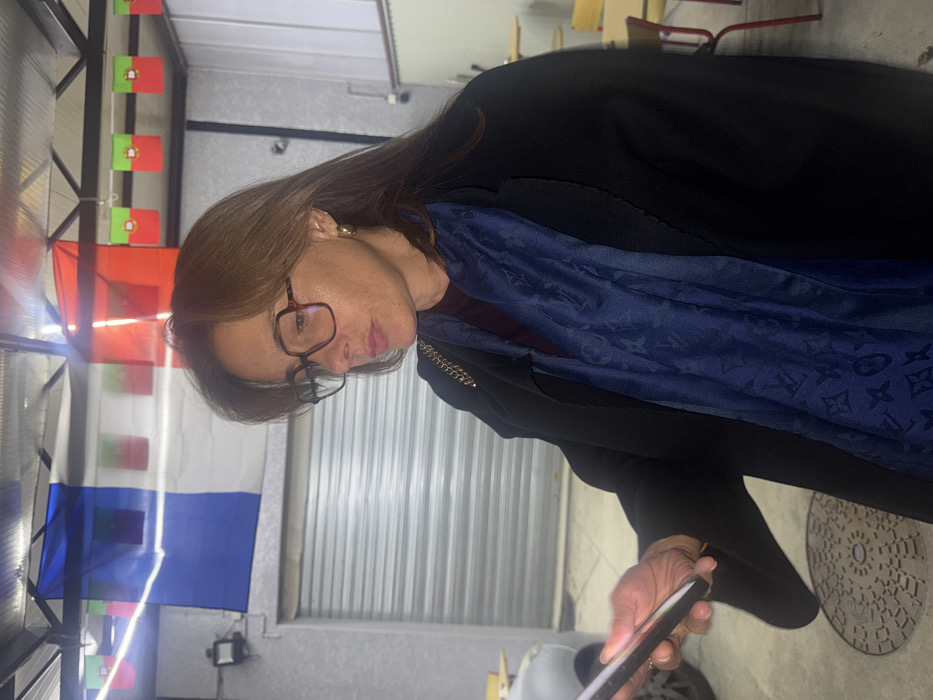 The scene depicts a woman in an indoor or sheltered outdoor setting in Décines-Charpieu, France. The woman, appearing middle-aged, has medium-length brown hair and is wearing dark-framed eyeglasses and small gold hoop earrings. She is dressed in a dark coat or jacket over a dark red garment, with a dark blue scarf, patterned with what appears to be a Louis Vuitton monogram, draped around her neck. A gold-colored chain strap is visible on her right shoulder. She is holding a smartphone in her left hand, looking down at its illuminated screen and seemingly interacting with it; a ring is visible on her left ring finger. The background features a large French flag (blue, white, red vertical stripes) hanging prominently from an overhead structure, likely a corrugated metal roof. To the right of the French flag, a string of smaller Portuguese flags (red and green with the national emblem) is also displayed. A light-colored wall with horizontal ridges, possibly corrugated metal siding, is behind the flags. Below the French flag, a closed metal roller shutter is visible, suggesting a secured entrance or garage. Partially visible on the far left is the front portion of a light-colored vehicle. In the blurred background on the right, there are yellow-topped tables with chairs featuring red legs, indicating a casual seating area. On the concrete ground directly below the woman's left hand, a circular metal manhole cover with an intricate pattern is present. The artificial lighting source overhead creates a glare in the image. The flags suggest a connection to both French and Portuguese culture.