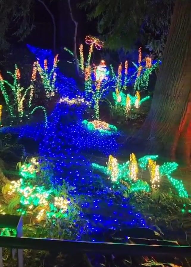 nighttime view of a festive outdoor display. A small, artificial waterfall is draped with blue lights. Surrounding the waterfall are various plants, all illuminated with colorful lights including green, white, yellow and red. To the right, a tree trunk is bathed in red light, next to brightly lit mushroom decorations. The camera slowly pans to the right, revealing more of the illuminated scene. A railing is visible in the foreground.