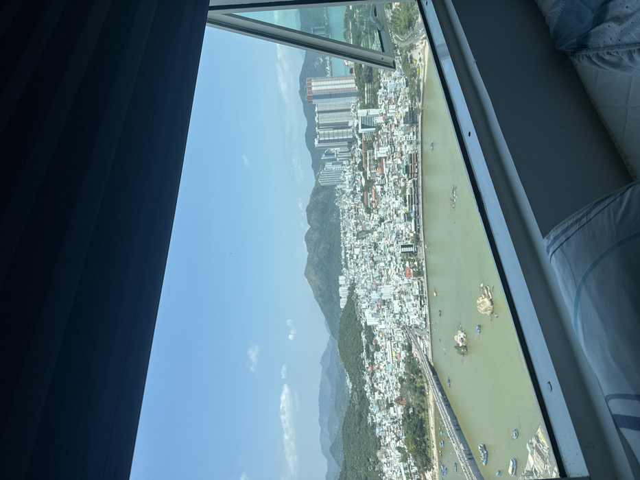 This image presents an elevated, panoramic view of the city of Nha Trang, Vietnam, observed from a high-rise window