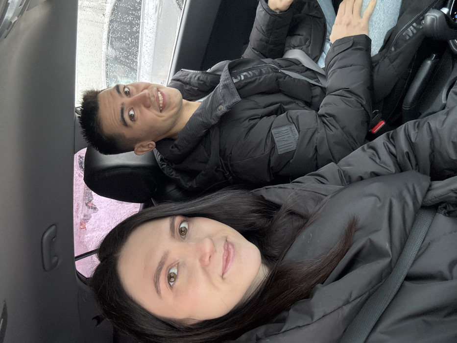 The scene depicts two individuals, a female and a male, seated in the front of a vehicle, located in Kazan, Russia. Both individuals are looking towards the camera and smiling. The female is situated in the front passenger seat on the left. She has long, dark hair and brown eyes. She is wearing a black puffer jacket with a prominent collar and is secured by a grey seatbelt. Her right arm is partially visible, extending downwards. The male is situated in the driver's seat on the right. He has short, dark hair. He is wearing a black puffer jacket with a textured grey collar lining and a rectangular black patch with white text on the left sleeve. He is secured by a grey seatbelt. His right hand rests on his thigh, which is covered by light-colored denim. The car's interior features dark-colored upholstery and trim. Through the rear window on the left, a blurry, pink-colored object or reflection is discernible. The front passenger window on the right is covered in precipitation, consistent with rain or sleet, obscuring the view of the exterior environment which appears overcast and includes other vehicles.