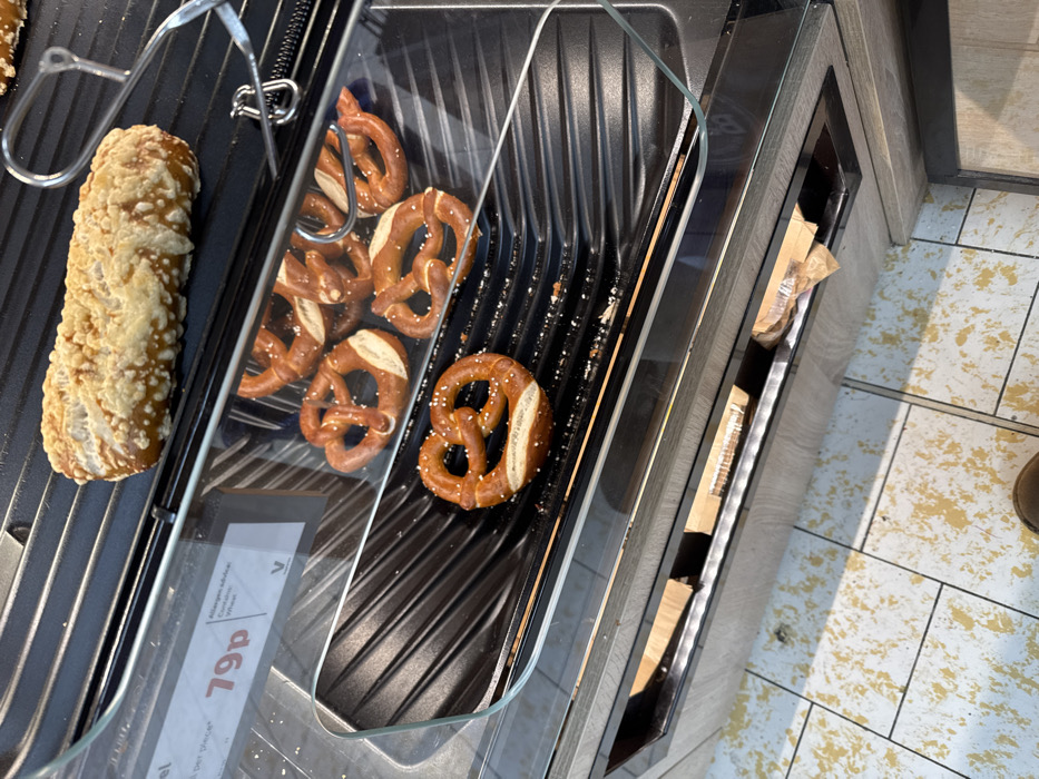This image depicts the interior of a retail food service area located in Hull, United Kingdom. The primary subject is a multi-tiered, heated glass food display unit showcasing baked goods. On the uppermost visible level of the display, a single elongated pastry, light brown in color and topped with melted, crumbled cheese, rests on a black ribbed surface. Directly below this, separated by a glass pane, are approximately five to six brown, salted pretzels, arranged on a similar black ribbed tray. A single, identical salted pretzel occupies the lowest visible level of the display, also on a black ribbed surface which shows scattered crumbs or salt. A white rectangular price label is adhered to the inside of the glass barrier, displaying "79p" in large red font, with smaller text indicating "per piece" and "Allergen advice: Contains Wheat," alongside a small green 'V' logo. The display unit itself features a dark metal frame and a wooden/laminate-effect counter. Below this counter, an open recess reveals brown paper bags or packaging material. The floor beneath the counter is tiled with a mottled white and yellow/beige pattern. A portion of a brown shoe is visible in the lower foreground, suggesting a human presence and a downward viewing angle into the display. No direct human actions or interactions with the food are depicted. The environment appears clean and well-lit, characteristic of a commercial retail setting.