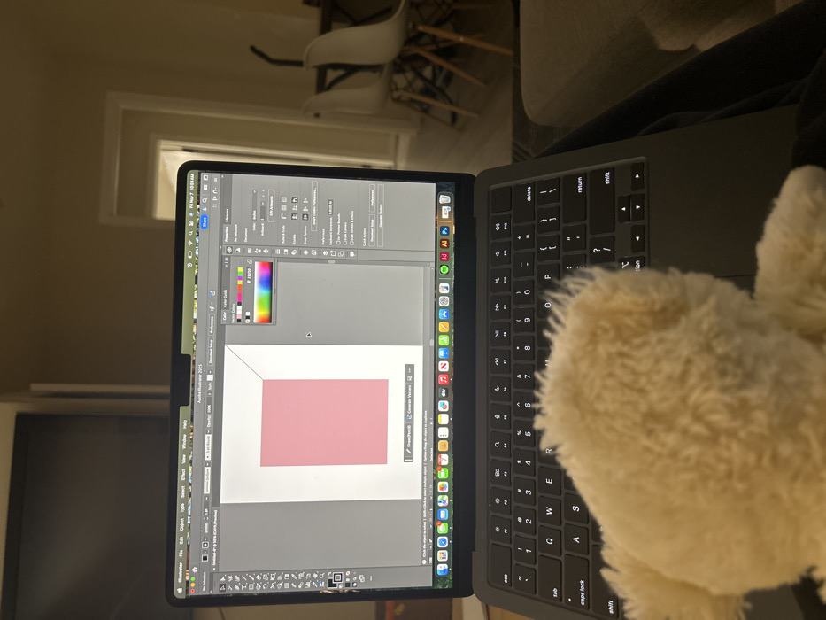 The image depicts an indoor scene in Vancouver, Canada, focusing on a dark-colored MacBook laptop open on a surface, likely a lap or table. The laptop screen displays Adobe Illustrator 2023, showing an artboard with a central pink rectangle (hexadecimal color #FF3366) and a partially drawn white border that creates a three-dimensional effect. The macOS menu bar indicates the date as "Nov 7" and the time as "10:59 AM". A light-colored, fluffy stuffed animal, possibly a teddy bear, rests on the laptop's keyboard, obscuring a portion of the left-hand keys. The background features dim, ambient lighting, revealing neutral-toned walls. To the upper left, a large, dark rectangular object, possibly a television or monitor, is visible. To the right, a white-framed doorway leads into an adjacent room where a dark table and two white, modern-style chairs with wooden legs are partially discernible. A light-colored sofa cushion is visible in the lower right foreground.