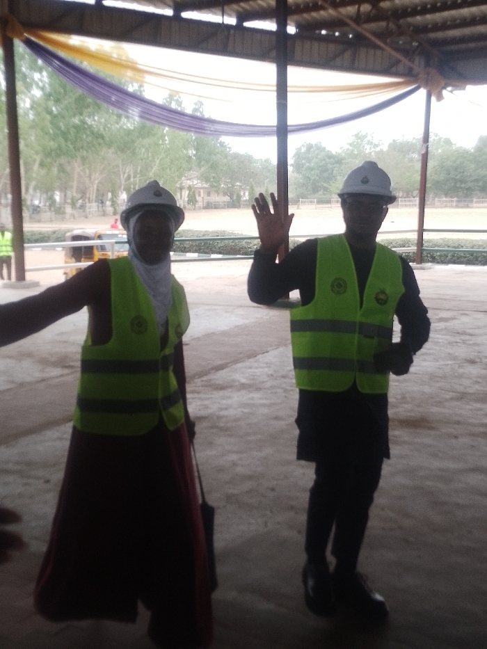 Two individuals wearing hard hats and neon vests stand indoors. One person, a woman, wears a headscarf and a maroon skirt. The other, a man, wears black pants and raises a hand in a wave. A stadium with trees is visible in the background. The image appears to be taken under a roof or shelter, with light fabrics suspended above. The setting suggests a construction site or a public event space.