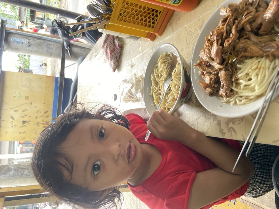 A young female child with dark hair, wearing a red t-shirt and dark plaid shorts, is seated at a table, looking directly forward. Her right hand holds a fork submerged in a white bowl containing noodles in a clear broth. A second white bowl, positioned closer to the foreground, contains noodles topped with a substantial portion of dark meat. Chopsticks and a spoon rest on the table beside this second bowl. On the table, to the right of the child's bowl, are a folded red and white checkered cloth, a small clear plastic bag, and a small dark circular object. Further to the right, a yellow utensil holder filled with forks and spoons stands next to an orange bottle, likely containing a condiment. The setting appears to be an outdoor or semi-enclosed dining area in Balonggabus, Indonesia, with metal support poles visible. In the background, a yellow corrugated metal structure, a dark motorcycle, and glimpses of a street or alleyway with other distant structures and vehicles are discernible. The lighting suggests daytime conditions.