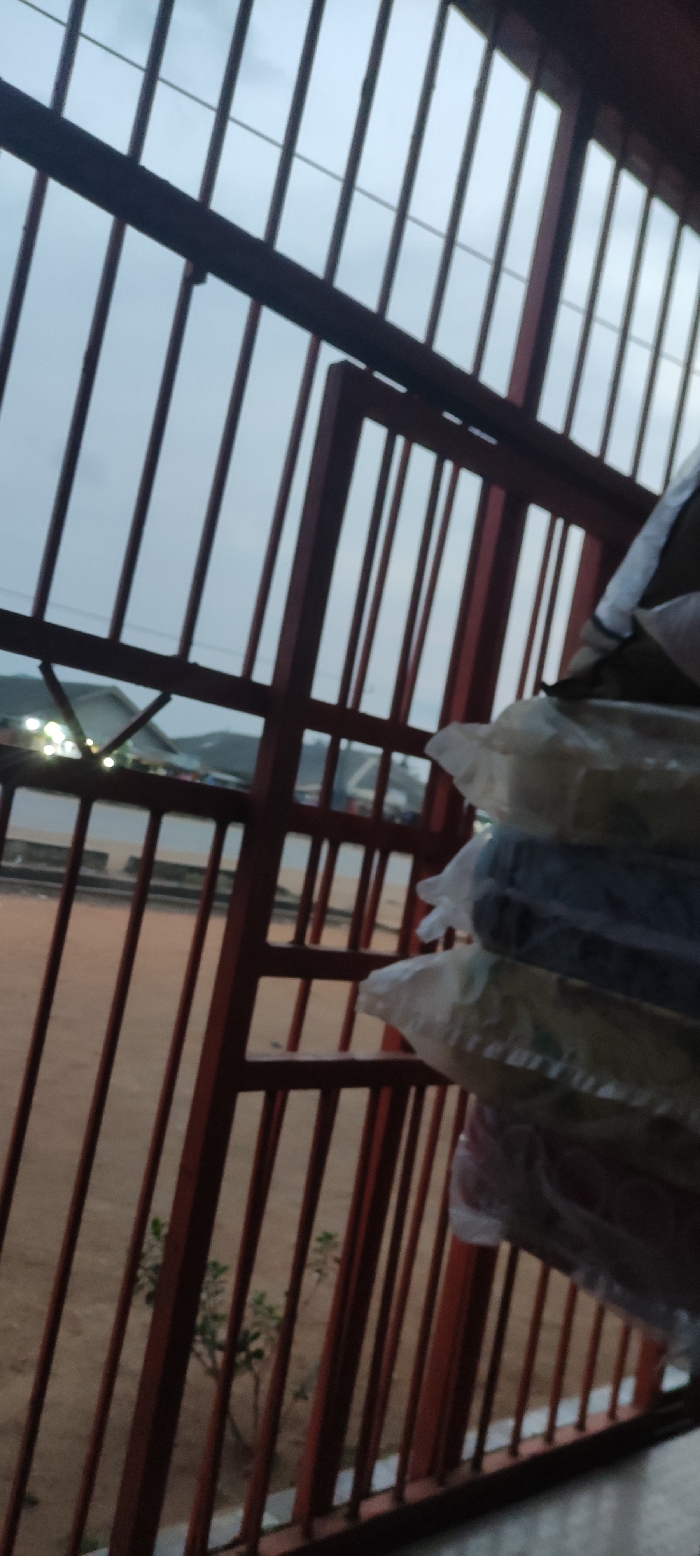 Through the bars of a red-painted metal gate, a view presents a sandy area, possibly a beach. Water and distant buildings are visible under a cloudy sky. In the foreground, stacked items wrapped in clear plastic obstruct part of the view, partially covering the gate's right side. A small green plant can be seen through the bars near the bottom. The gate and the wrapped items are the main focus, with the outdoor scenery serving as the background.