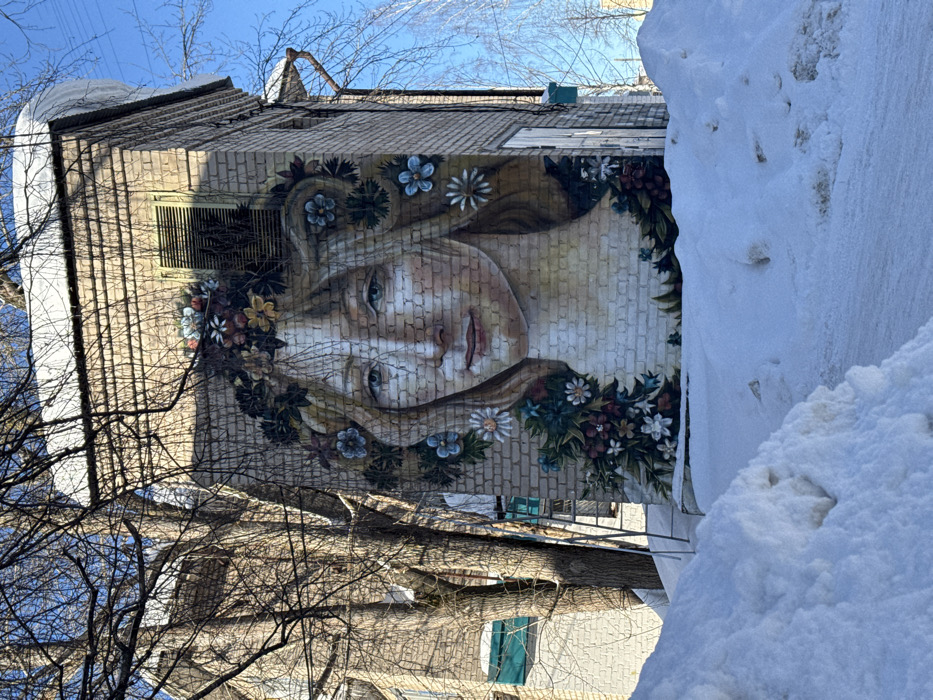 A large mural depicting a woman's face and upper torso is painted on the light-colored brick exterior of a building in Chaikovsky, Russia. The woman has long blonde hair, blue eyes, and her head is adorned with a wreath of various colorful flowers and green foliage. Additional flowers and foliage are depicted around her neck and shoulders. The mural's artwork integrates the brickwork texture. The building is a multi-story brick structure with a snow-covered roof. A dark ventilation grate is visible on the upper right side of the mural, and a small teal utility box is affixed to the right side of the building below a white downspout. Deep snow banks cover the ground in the foreground and around the base of the building. Bare deciduous trees are visible on the left and in the background. A silver-colored step ladder leans against the left side of the mural building. The scene is illuminated under a clear blue sky, indicating daylight.