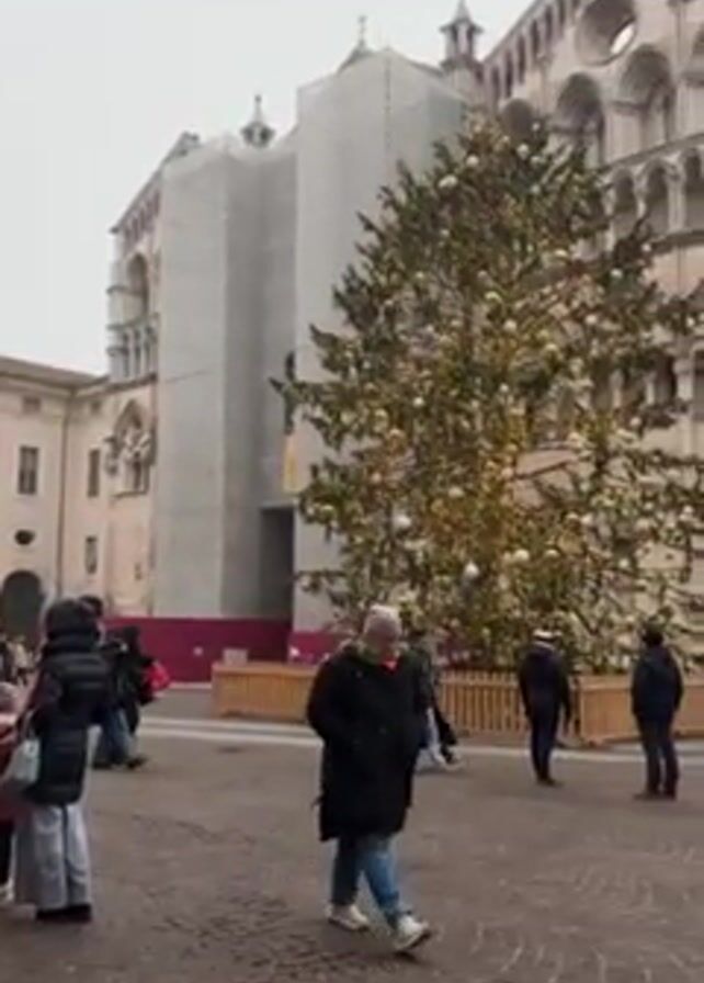 town square in Italy, with a large Christmas tree decorated with gold balls as the central focus. There are several people walking around the square, most wearing dark winter clothing. Buildings surround the square, with an older stone building under scaffolding, and a more modern red brick building, which appears to house a McDonald's. The sky is overcast and grey, suggesting a cold day. A woman in a black coat and jeans walks towards the camera, then stops and looks to the left. A song is playing in the background.