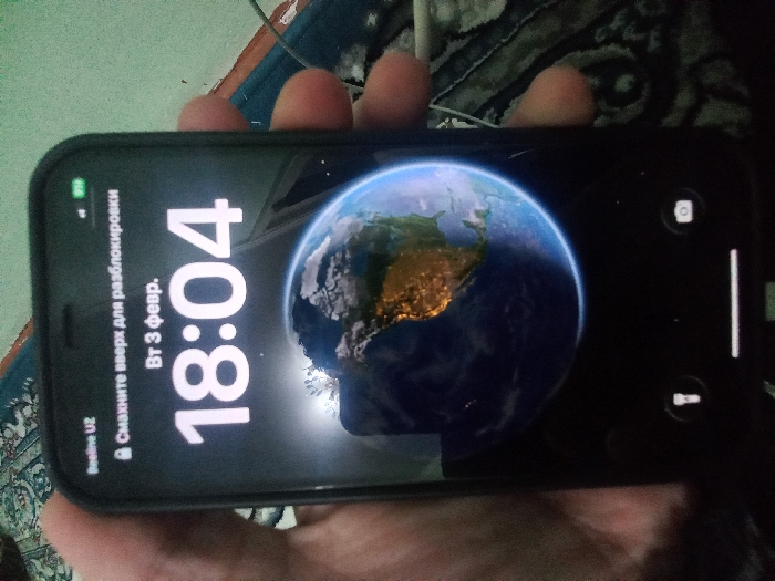 A close-up photograph depicts a black smartphone held in a human left hand. The phone's screen displays a lock screen with the carrier "Beeline UZ," indicating operation within Uzbekistan, consistent with the specified location of Fergana City. The screen shows a Wi-Fi icon, cellular signal, and 91% battery charge. Russian text reads "Смаxните вверх для разблокировки" (Swipe up to unlock). The date is "Вт 3 февр." (Tuesday, February 3rd), and the time is "18:04." The background wallpaper features an image of Earth from space, primarily showing North and South America, illuminated by a sun source from the upper left, casting a prominent lens flare. At the bottom of the lock screen, a flashlight icon is on the left and a camera icon on the right, with a horizontal home bar centered below them. The hand, with a light to medium skin tone, grasps the phone from the left with the thumb and from the right with the index, middle, and ring fingers. The background is out of focus, revealing a patterned rug or textile in shades of green, blue, and light colors to the left and top, and a darker, patterned surface with a partial white cable visible to the right, suggesting an indoor residential setting.