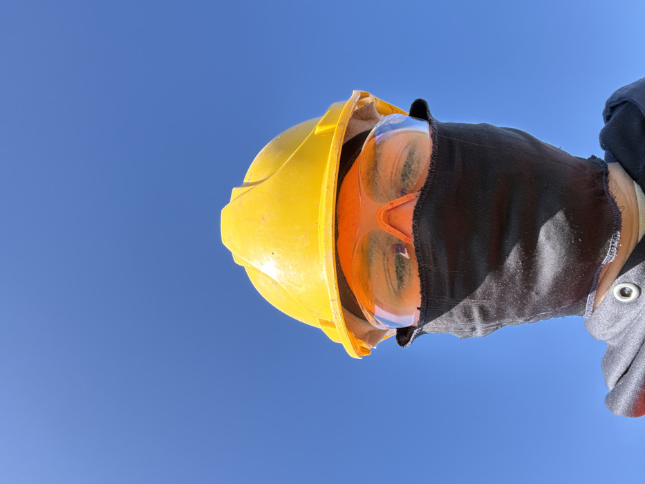 A subject is depicted in a low-angle portrait, framed from the upper chest against an unobstructed, clear blue sky, identified as being in Wellington, United Kingdom. The individual wears personal protective equipment: a yellow hard hat, orange-framed clear safety goggles over their eyes, and a black fabric face covering concealing the nose, mouth, and chin. Below the face covering, a dark grey or black hooded garment, possibly a sweatshirt or jacket, is visible, featuring a silver grommet on the left side near the neck. The subject's eyes, visible through the goggles, appear closed or significantly shadowed. The overall scene suggests an outdoor setting under bright daylight conditions.
