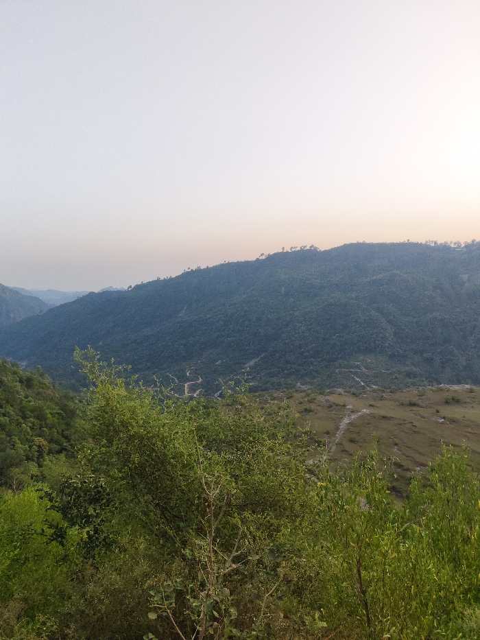 The image displays an elevated panoramic view of a mountainous and valley landscape in Holar, Pakistan. The upper half of the frame is dominated by a pale, hazy sky, transitioning from a light blue at the horizon to a near-white overhead. Across the mid-ground, a prominent mountain range is visible, densely covered with dark green foliage, primarily trees, with individual trees distinguishable along its crest and slopes. In the far background, fainter blue-gray mountain silhouettes recede into atmospheric haze. The immediate foreground is densely filled with various green shrubs and tree branches, some in sharp focus. Below the central forested mountain, a valley floor is apparent. The left side of the valley shows steep, heavily vegetated terrain. The right side features more open ground, characterized by patches of lighter green or tan vegetation, possibly dry grass or scrubland, with discernible winding dirt paths or dry stream beds. A prominent S-shaped winding path or road traverses the central valley floor. No human subjects, animals, or significant man-made structures are present within the scene.