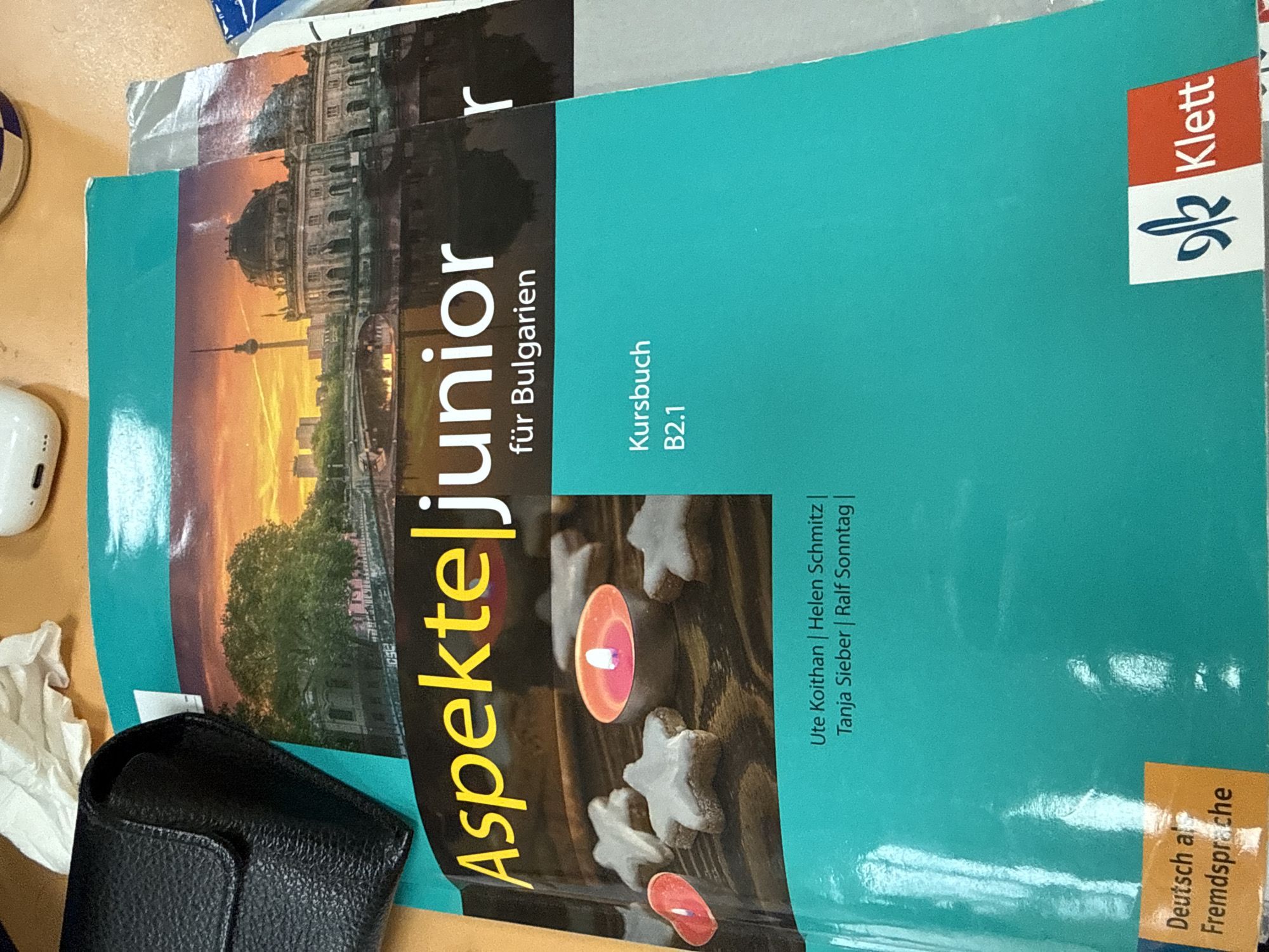 stack of German language textbooks. The top book is "Aspekte Junior für Bulgarien," Kursbuch B2.1, published by Klett. The authors are Ute Koithan, Helen Schmitz, Tanja Sieber, and Ralf Sonntag. The cover features an image of lit candles and star-shaped cookies. Below the stack is a partially visible book with a city scene on its cover. Other objects in the scene include a white wireless earpiece and a black leather wallet. The photograph is taken from an overhead perspective. The city location of Pernik, Bulgaria, is not depicted in this image.