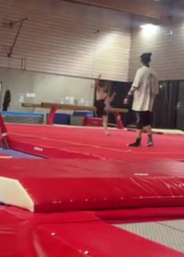 In a gymnastics gym, a shirtless young man in black shorts performs on a balance beam