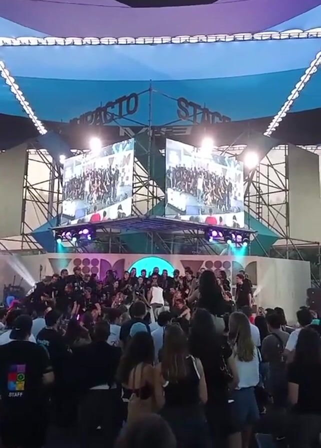 stage at an event called "IMPACTO STAGE." The stage is well-lit with two large screens displaying a group photo. In front of the stage, a crowd of people, most with dark hair and wearing casual clothing, are facing the stage, with some holding up their phones to record. A large group of people is on stage as well, including some who are seated. Above the stage is a canopy structure with fabric in blue and white shades. The overall setting suggests a festive and celebratory atmosphere, potentially at an outdoor event.