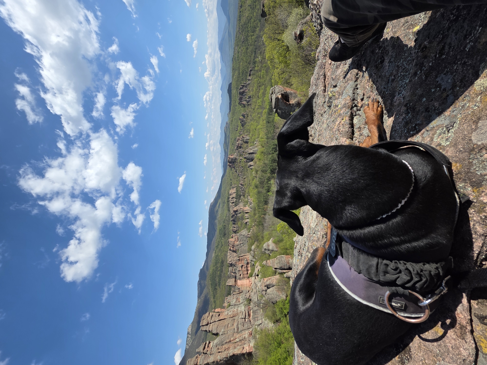 - "From a high vantage point in Belogradchik, Bulgaria, a black and tan dog with a harness sits on a rocky outcrop" by FM-3O4tD2, licensed under CC BY 4.0
