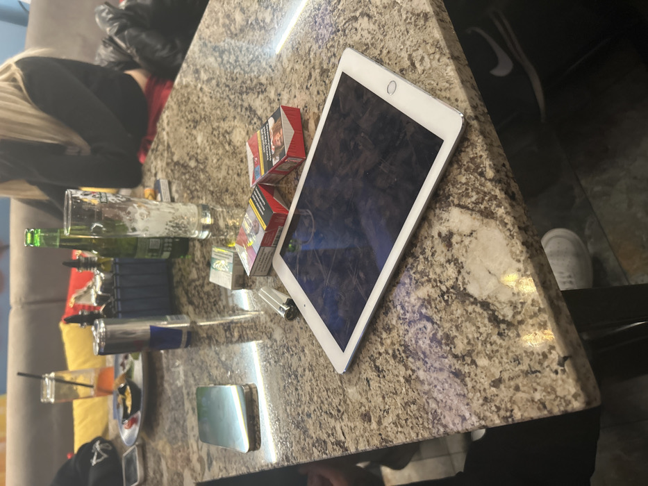 The image depicts a detailed tabletop scene within an indoor establishment, identified as being in Sofia, Bulgaria, based on the Bulgarian tobacco warning label visible on cigarette packs. The table surface is composed of light brown and cream-speckled granite. Prominently in the foreground, a white iPad with a dark, smudged screen lies flat, home button oriented towards the bottom right. Adjacent to it are two red cigarette packs, identified as Rothmans, with one clearly displaying the Bulgarian warning "ПРОДАЖБАТА НА ТЮТЮНЕВИ ИЗДЕЛИЯ ЗА ЛИЦА ПОД 18 ГОДИНИ Е ЗАБРАНЕНА." A small metallic silver lighter rests nearby. Further back on the table, a silver smartphone lies face-down, reflecting overhead light. An empty, tall glass with foam residue, bearing a partial Heineken logo, stands upright next to a green beer bottle and a blue and silver Red Bull can. A blue condiment caddy containing several small, silver-capped bottles is also present on the table, along with a plate holding remnants of food (a yellow substance) and a clear glass with a dark liquid and a straw. A second light-colored smartphone is positioned on the far left. At least three individuals are present within the frame. A person with long blonde hair, wearing a dark long-sleeved top and a red plaid lower garment, is seated on a gray upholstered sofa in the background, with a black puffer jacket draped next to them. Partial views of two other individuals are discernible: a person in dark clothing with a white sneaker visible under the table on the left, and another person indicated by a dark sneaker with a white Nike swoosh visible under the table on the right. The scene suggests a casual social gathering involving drinks, food, and tobacco consumption.