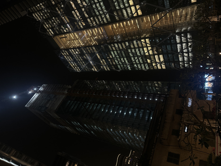 - "An upward nighttime view captures the intricate latticework of a high-rise building's facade, its windows glowing with warm interior light" by FM-OecyI3, licensed under CC BY 4.0