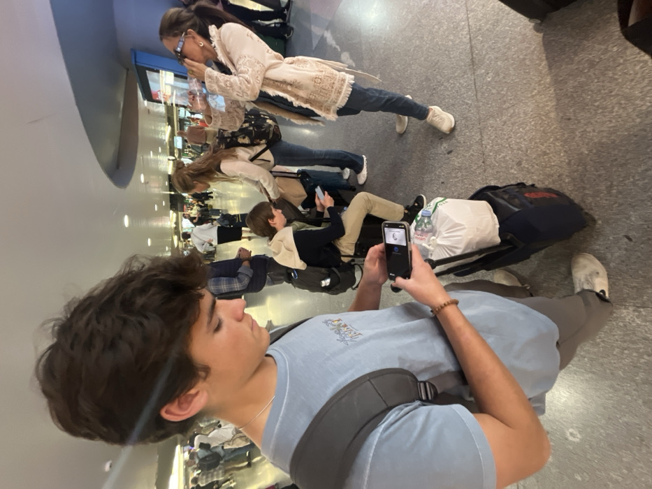 group of people in a train station. The location is in Granada, Spain, based on the coordinates 37.183 latitude and -3.598 longitude. The image captures a young man in a blue shirt, holding a cell phone and a large black suitcase. The man is in the foreground. Behind him are a couple of other people, including a young boy seated on the floor, a woman in a white shirt, and a woman in a long-sleeved beige jacket. There are other people in the background, many of whom are walking in different directions. The man with the phone is focused on the device. He has a casual appearance and is wearing a blue shirt with white lettering, light brown pants, and brown shoes. The woman in the white shirt is wearing jeans, a brown bag, and sandals. The woman in the jacket has a blue and black bag on her back, is wearing blue jeans, and is looking down. The young boy is sitting on the floor, holding a phone, and is wearing a brown jacket and brown pants. The floor of the train station is tiled and is speckled with light and dark grey.