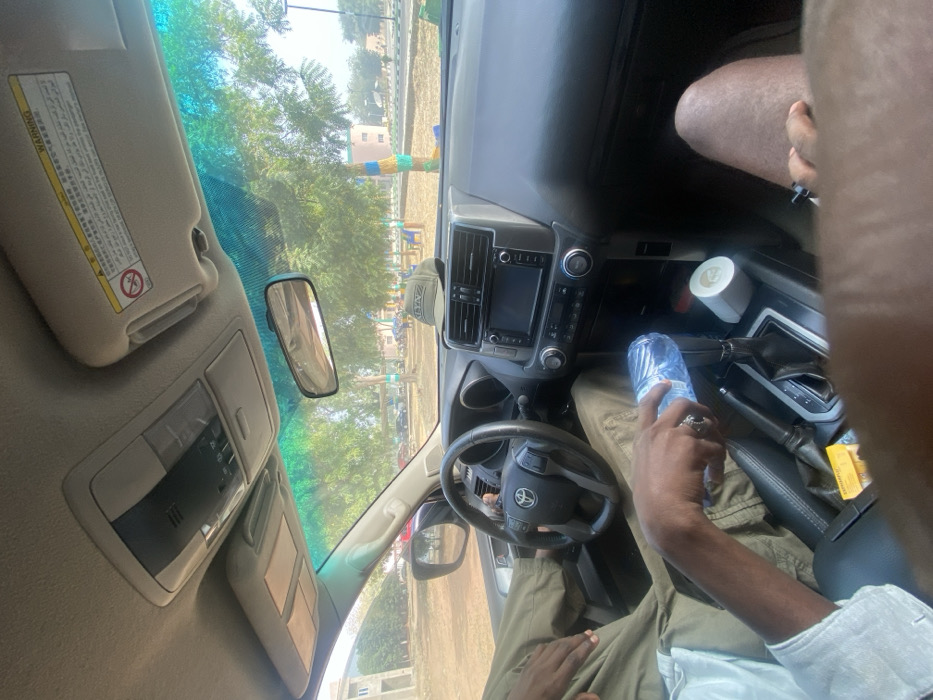 The image depicts an interior view from the front passenger seat of a Toyota Land Cruiser Prado SUV, parked outdoors in Yan Dala, Nigeria, during daylight hours